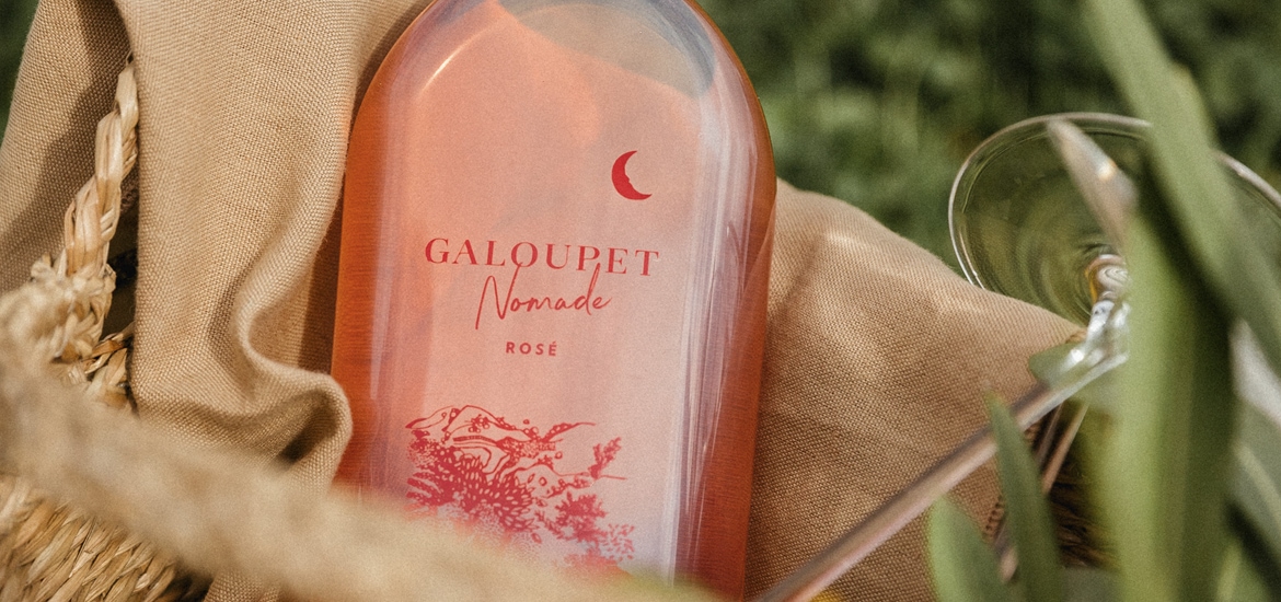 The bottle is made by Packamama, formerly known as Garçon Wines, and weighs 63 grams, almost 10 times lighter than a standard rosé bottle. This lends the bottle a lower carbon footprint, and, combined with its novel flat shape being 40% spatially smaller than a circular format, also means it is more efficient to pack, transport and post. Not only is the bottle a first for Moët Hennessy and Côtes de Provence, but it also sets a new precedent for Packamama, as Galoupet Nomade uses silk screen printing techniques applied directly on to the format, which has never been done before with a plastic wine bottle.
