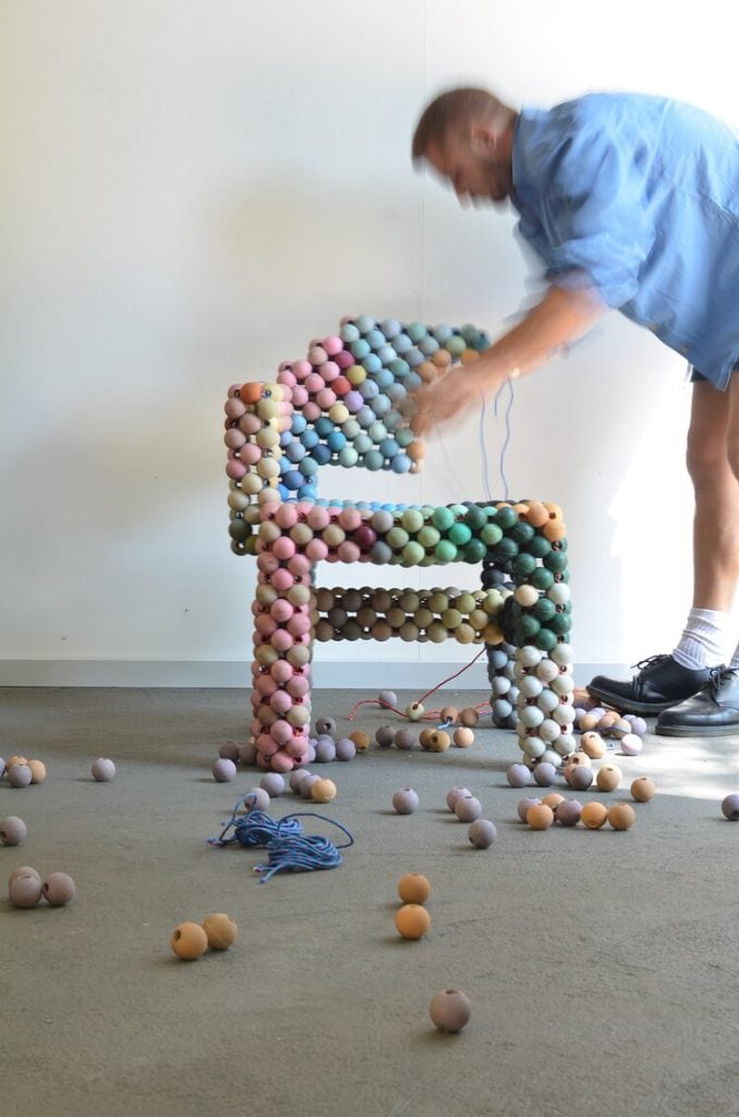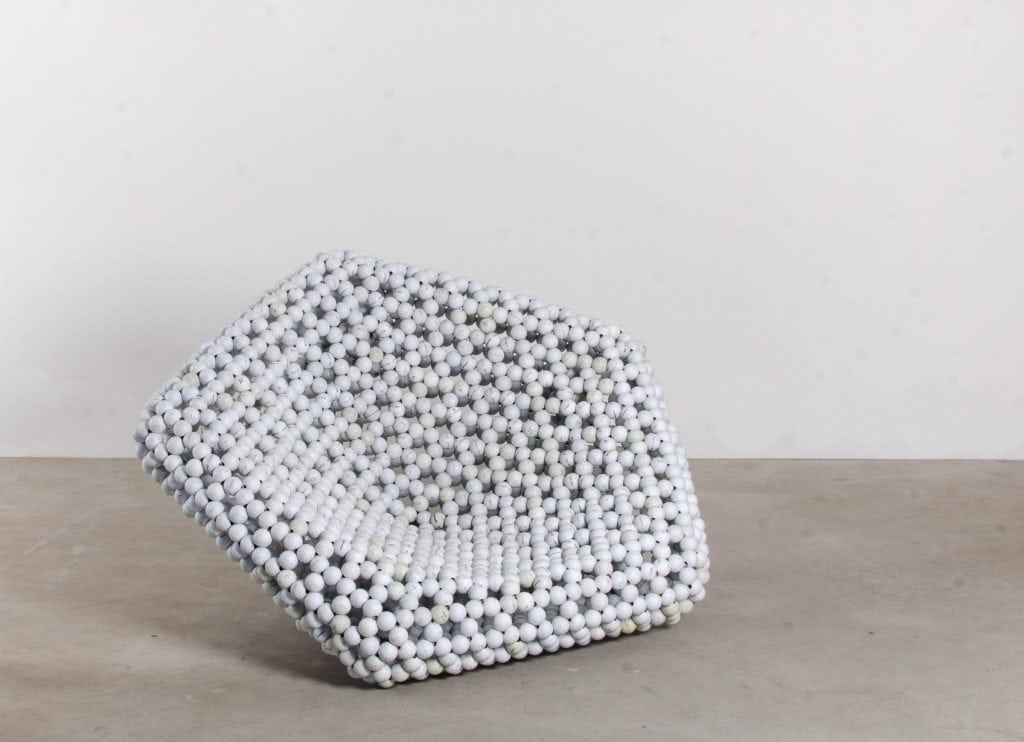 Since 2017, his project WovenSolid (GolfWeave) has become the focus of his practice. Using discarded and ‘unusable’ golf balls as beads arranged in a manner similar to carbon atoms and held by polyester yachting cord, Jake crafts his objects into various shapes. The curves in his designs mimic ones we see in isolation in all carbon allotropes simulated, re-presented and enlarged to a human scale. And just as in nature, his technique presents an amalgamation of atoms with semi-permanent bonds. Nature uses the same general principle to make and unmake all the different compounds that surround us. Similarly, and without any material loss, Jake’s designs can be unbound and returned to their base components, golf balls and cord, where these materials can be rewoven into new geometries and become entirely new objects.
