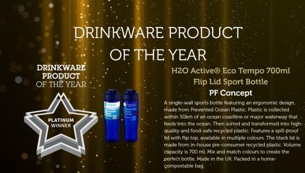 PF Concept‘s H2O Active® Eco Tempo 700ml sport bottle, made entirely from Prevented Ocean Plastic, was the platinum winner in the drinkware category at this year’s BPMA awards.